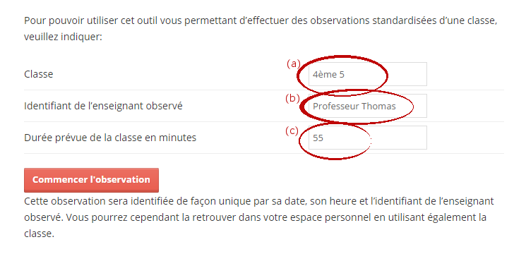 - l’identifiant de l’enseignant observé lui permettra de suivre ses progrès d’une observation à l’autre. Vous pouvez utiliser un nom ou un identifiant anonyme.